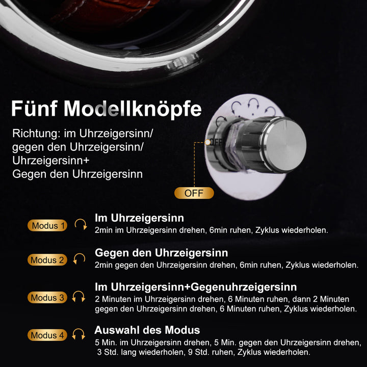 4 Rotationsmodi: Der automatische Uhrenbeweger verfügt über 4 Modi, die die Bedienung des Uhrenbewegers erleichtern. Und besser kompatibel zu Ihren Automatikuhren.