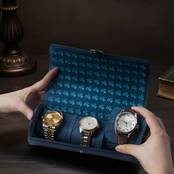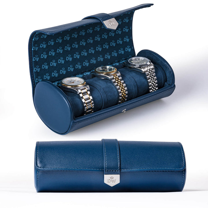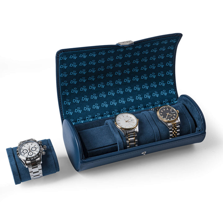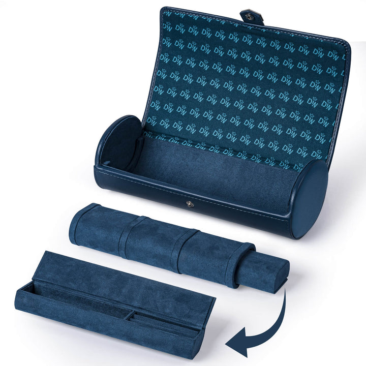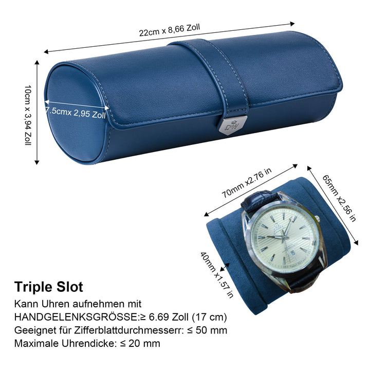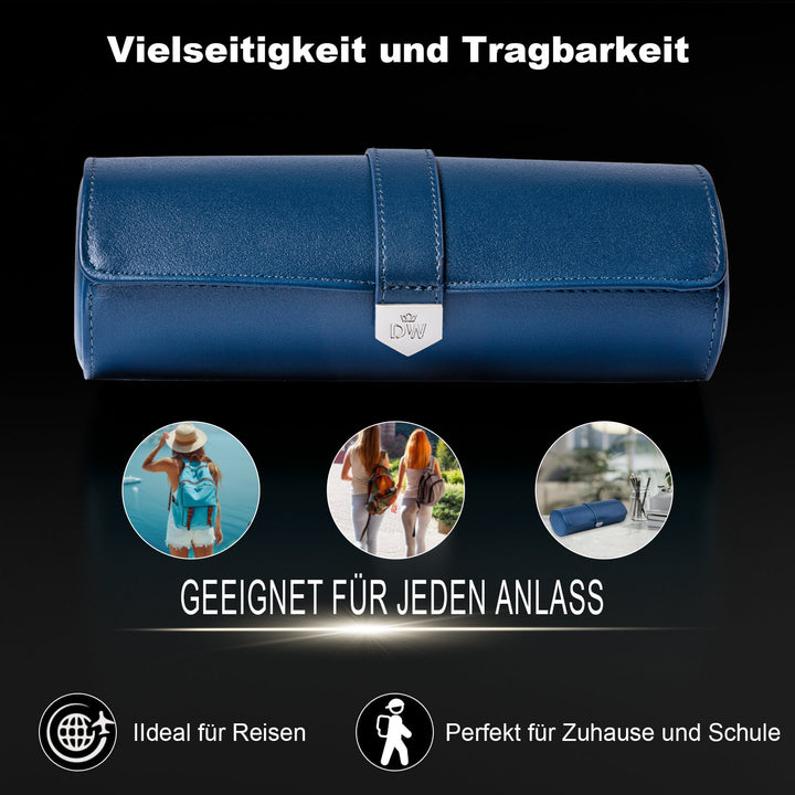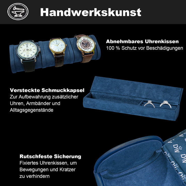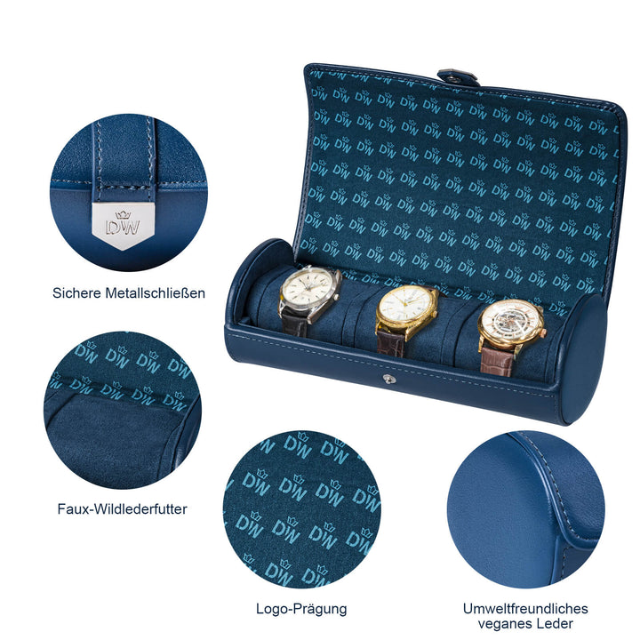 Dreifach-Uhrenetui aus veganem Leder mit verstecktem Schmuckfach – Blau