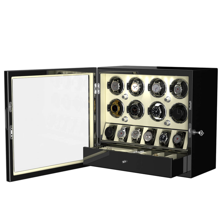Material: Der automatische Uhrenbeweger von Dukwin für 8 Uhren besteht aus handgefertigtem Holz mit einem Fenster aus organischem Acrylglas, einer stilvollen Klavierlack-Außenseite und einer Innenseite aus veganem Leder.