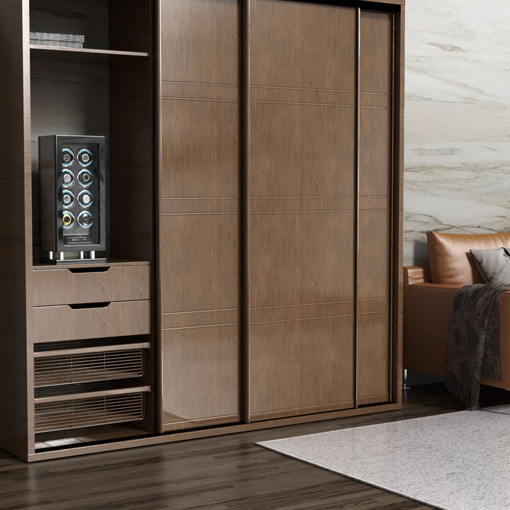 ATEMBERAUBENDES DESIGN: Die Uhrenbeweger bestechen durch ein atemberaubendes Interieur aus hochwertigem PU-Leder und Sandelholz mit Hochglanz. Die 10-Schichten-Mirage-Schwarze Außenbeschichtung verleiht Ihrem Zuhause einen eleganten und luxuriösen Akzent.